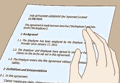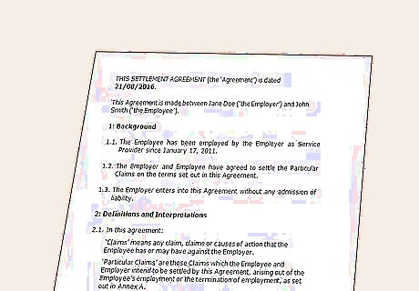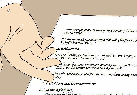 Draft a settlement agreement. Once you agree to the terms of the settlement, you should write them down in a formal agreement. If either side has an attorney, he or she will probably take the lead in drafting the settlement agreement. Review it with your attorney. If you settle with an insurance adjuster, write the terms of the settlement in a letter. Mail it to the adjuster and ask that he or she respond in writing confirming the details of the agreement. See Write a Settlement Agreement for more information.