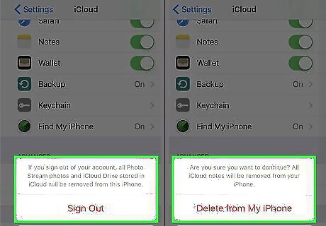Sign out of iCloud, iTunes, and the App Store. If you're using iOS 10.3 or later, tap Settings > [your name] > Sign Out. Enter your Apple ID password and tap Turn Off. If you're using iOS 10.2 or earlier, tap Settings > iCloud > Sign Out. Tap Sign Out again, then “Delete from My iPhone” and enter your Apple ID password. Then go to Settings > iTunes & App Store > Apple ID > Sign Out. If you’re not sure which iOS you’re using, you can find it by going to Settings > [your name’s] iPhone, and looking at Version.