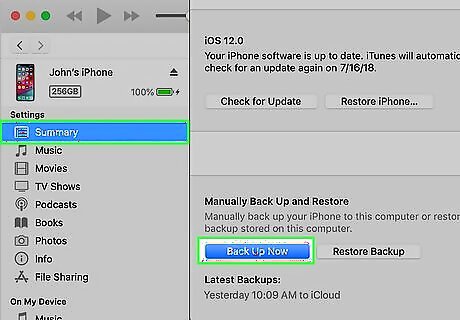 Back up your iPhone on iTunes if you prefer. Update your computer to the latest version of iTunes. Open iTunes and connect your phone to your computer with a USB cable. iTunes will prompt you with instructions to “trust the computer” and complete the back up. To make an unencrypted backup, just click Back Up Now. To make an encrypted backup, select the box called Encrypt iPhone backup and create a password. It’s best to encrypt your backup if you are saving sensitive information, such as health or financial information.