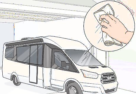 Clean the interior and exterior of the RV. Use cleaning wipes or a cleaning spray to wipe down everything inside of the RV, such as counters, appliances, and windows. Use a broom or vacuum to get rid of any dirt and dust on the floors and seats. Give the RV’s exterior a good cleaning using a hose and soap to make sure it’s looking its best. Use a deodorizing spray to get rid of any unwelcome scents.