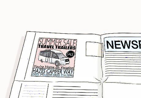 Post about the RV in your local newspaper or magazine. Take out an ad in your local paper telling everyone that you have an RV for sale, or see if you can get it printed in a local magazine. Send the newspaper or magazine pictures of your RV for them to use if they’d like. Call your local newspaper or magazine to ask them about taking out an ad, or email them to ask your questions.