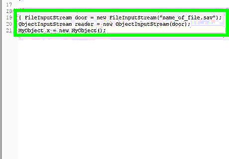 It can be read like this: try{ FileInputStream door = new FileInputStream("name_of_file.sav"); ObjectInputStream reader = new ObjectInputStream(door); MyObject x = new MyObject(); x = (MyObject) reader.nextObject();}catch (IOException e){ e.printStackTrace();}Serialize an Object in Java Step 6 Version 3.jpg