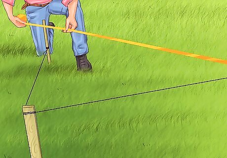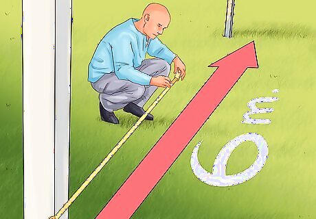 Mark out the long side. The long side of your arena will be either 40 meters or 60 meters, depending on the size of arena that you want and/or need. If you are using the ring for more advanced purposes (higher level competition) or want the standard arena size, you should mark out 60 meters. If you do not have space for the standard size arena or plan to use your arena more casually, you could mark out 40 meters. Ask your trainer which is better for you. Use surveyor’s tape or a measuring wheel to mark out this distance from the first stake that you’ve used to create your right angle. Put another stake in the ground to signify this distance. Tie string between the two stakes and measure the distance again, to be sure.