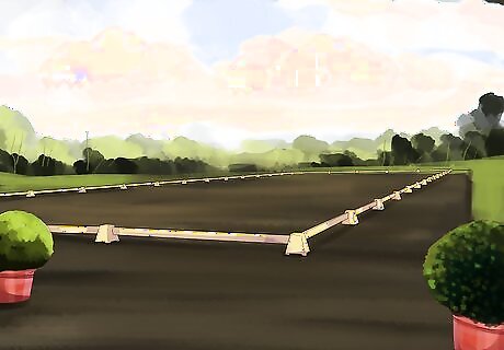 Make sure your space is the right size. Before you set up the arena, you will need to make sure that you have a big enough place for the arena. A standard dressage arena is 20 meters by 60 meters (or about 66 feet by 197 feet). A short dressage arena is 20 meters by 40 meters (or about 66 feet by 132 feet). Find a space where you will have 1-2 meters (about 3 to 6 feet) of buffer around the outside of the arena. A standard-sized or larger arena (100x200 ft) will give you room for a full jump course and for advanced riders to practice longer gaits with more space.
