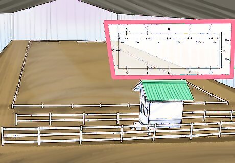 Place the letters. Letters in a dressage arena, which are used for the purpose of memorizing and executing patterns, are always in a specific pattern. They are also different for standard arenas and small arenas. Placing your letters in the right order is very important. You’ll need them in practicing and memorizing your patterns, which will give you confidence when you go to a show with similarly arranged letters. The easiest way to place dressage letters is to look at a diagram of the arena size that you want. These diagrams are available easily online. The letters for a standard dressage arena are in the pattern, if you are starting on the short side and moving counter-clockwise, A (on the short side), K, V, E, S, H (all on the long side), C (on the short side), M, R, B, P, F (all on the long side). Then, on the center line, moving away from A, there are D, L, X, I, G. The letters and placement are a little bit different for a small arena. Going counterclockwise, you should still place A in the middle of the short side, then K, E, H (all on the long side), C (in the middle of the other short side), then M, B, F (all on the long side), and then, going up the center line from A, D, X, and G.