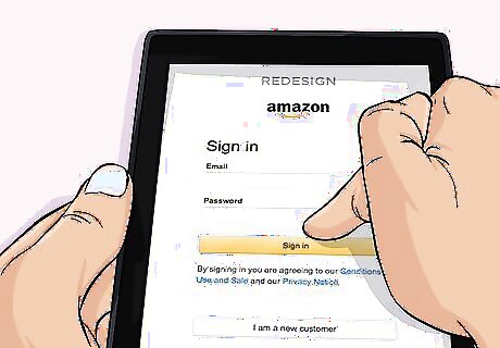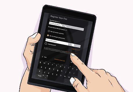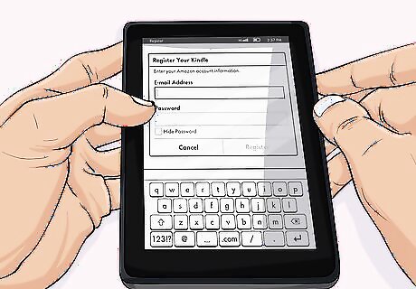 Continue to the “Register Your Kindle” page. When setting up your Fire HD for the first time, a series of screens will automatically populate your screen. After you finish connecting your Kindle to your wireless network, the “Register Your Kindle” page should be prompted to appear on your screen. On this page you should see: The subheading “Enter Amazon Account Info” Following the subheading should be two text entry boxes, one for entering your email address and another for your password.