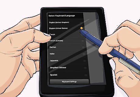 Change your language settings, if you desire. After bringing your Kindle out of standby mode by pressing the button located at its bottom and swiping your finger to access your home screen, draw your finger downward from the top of your screen. This should pull down a menu containing "Settings." Tap this and: Select "Keyboard and Language" from the following list of options. Choose "Language" from the resulting list. Select your language from the list of languages. Change your keyboard language by selecting "Current Keyboard" from the "Language and Keyboard" menu. Then select "Keyboard language" → "Use System Language", and manually select your keyboard. You may need to download a new keyboard for your language, which can be done on the "Current Keyboard" menu by selecting "Fire Keyboard" and then choosing your desired language.