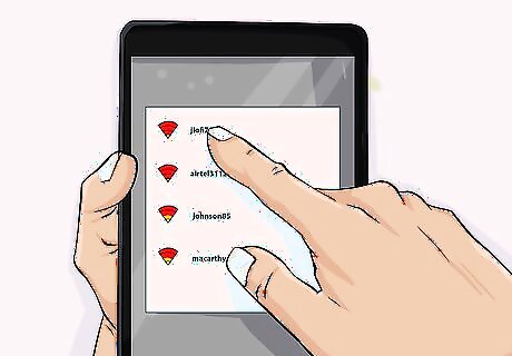 Troubleshoot Wi-Fi issues, if necessary. If other devices in your home can connect to your wireless network but your Kindle cannot, you might have to contact your Internet service provider. Before you do, though, try these common fixes for connectivity issues: Turn Airplane Mode off. Swipe from the top of your screen to the bottom, tap the “Wireless” option, and tap “Off” if the Airplane Mode option is set to “On.” Reset your Wi-Fi connection by swiping from the top down on your Kindle screen, tapping Wireless → Wi-Fi → Off. Then tap “On” to reset your devices connection to your wireless network. Restart your Fire HD by pressing and holding the power button on the bottom for 40 seconds. Once the device begins to restart, let go of the power button. If your Fire HD doesn’t restart, press the power button again to turn it on. Position your device closer to the router. Especially if you cannot find your network in the list of networks, move closer to the router and from the Wi-Fi menu, accessible by swiping from the top of the screen down and tapping Wireless → Wi-Fi, select “Scan.”