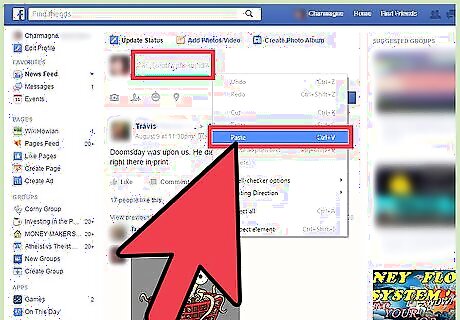 Share the mp3 on Facebook. Go back to your Facebook tab, and right-click the “What's on your mind” text box at the top of your News Feed or Timeline and select “Paste” to paste the URL in it. Facebook will create a clickable link at the bottom of the Status Update box. You can enter a message about the song if you want, and when you're ready to share the mp3 file, just click the blue “Post” button at the bottom right of the Status Update box.