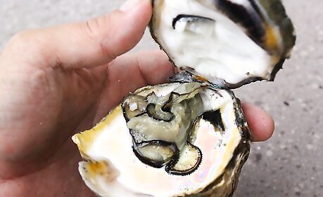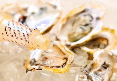Squirt some sauce onto the fresh oyster. Use hot sauce, vinegar sauce, or lemon juice.