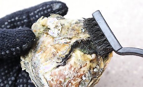 Scrub the oysters clean. Use the stiff-bristled brush to scrub the ocean grit from the oysters. Rinse the scrubbed oysters in cool running water. As you handle each one, make doubly sure the oysters are alive and fresh.