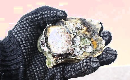 Grasp an oyster in one hand, cup-side down. The curved side of the oyster should be against the palm of your hand. The point, or hinge, should be facing toward you.