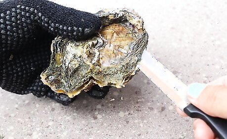 Put on the gloves. Oyster shells are sharp, and you'll definitely cut yourself if you aren't wearing a pair of tough rubber or canvas gloves when you're shucking them. Don't forego this simple safety measure.