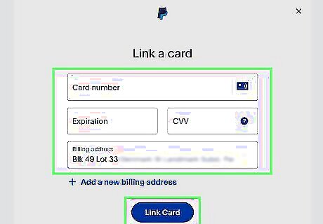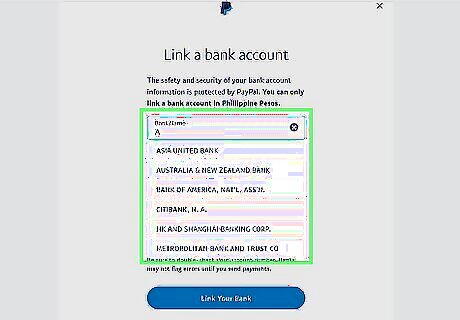 Link your account manually (if needed). If your bank wasn't listed, you'll have to enter your account information manually: Use the search bar to search for your bank. If no options match, click Debit or credit card if you're linking a card, or Enter your bank details if linking a bank account. Checking or savings account: Type the account number and routing number when prompted. You'll find these numbers at the bottom of a check or on your banking statement. Debit or credit card: Type the card number, expiration date, 3-digit CVC code, and other info when prompted. Click Agree and Link (bank account) or Link Card (credit/debit card). If you entered your bank account number manually, check your bank account in 24-48 business hours. PayPal will make two small deposits into your account, totaling less than a dollar. You'll need to enter these two values to confirm that you are the owner of the bank account. To confirm your deposits after 2 business days, log back into PayPal, and click the red Confirm icon under your bank's name on the right side of the page. You can also click the Wallet tab, select your bank, and click Confirm bank. Enter the two amounts as they appear on your statement to confirm your account.