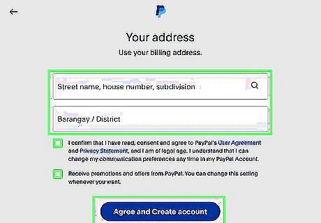 Create a password and click Agree and Create Account. The information you'll need to enter will be a little different depending on the type of account you're creating. Enter all required information, including your full name and contact info, and create a secure password for your account. If you're creating a personal account, be sure to use your full legal name to avoid any issues transferring money to and from your bank account. If you're creating a business account, enter the address of your business and provide all additional requested details. Follow the on-screen instructions to create your account. PayPal will walk you through the remaining steps of setting up and verifying your account. Once you agree to the terms, your PayPal account will be ready to use.