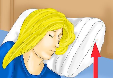Elevate your head with pillows. Using one to two pillows to raise your head four inches will make it easier for you to breathe as you sleep. You may also want to consider buying pillows that are specially designed to keep your neck muscles relaxed and open, allowing you to get a more comfortable sleep. Sleeping with your head elevated can be especially helpful for those who have sleep apnea or acid reflux. You may need to try sleeping on one to two pillows for a few nights to determine how many pillows you require to be comfortable when sleeping at night. You may want to consider orthopedic pillows that conform to your neck and head and provide good support as you sleep. Wedge-shaped foam pillows can also support your head and help you breathe properly when you sleep on your back.