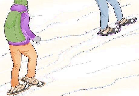 Take turns breaking the trail. If you are not on an established trail, walk in a single file line, allowing the person at the front to set the pace by stepping on the untouched snow. Breaking a trail this way is much more tiring than normal walking, so switch places to share the effort among all the participants.