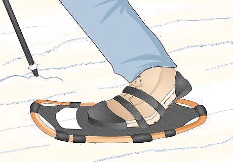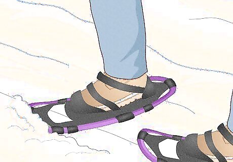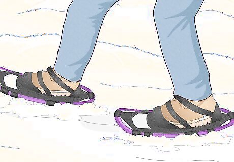 Walk with a wide stance. You will probably have to widen your stance a bit to accommodate for the width of the each snowshoe, which may give your hips more of a workout than you are used to. Walk at your normal pace, leading with your heel and rolling over the ball, then the toe.