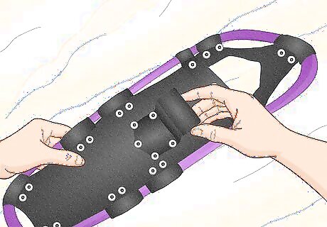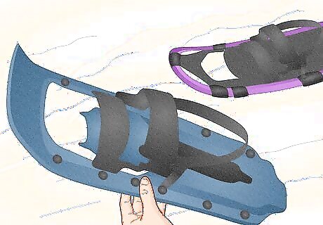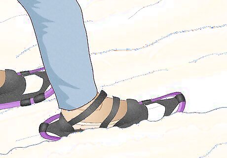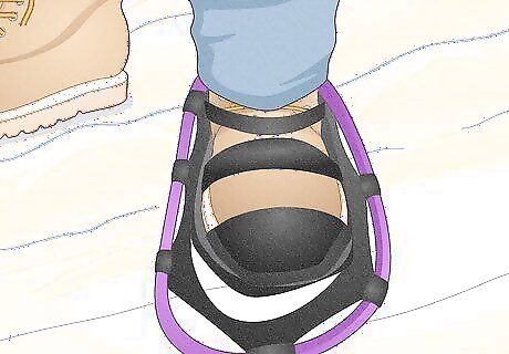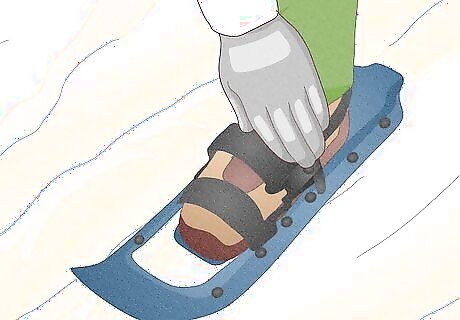 Strap on your snowshoes. Put your boots on first, then fasten the snowshoes over them one at a time. Position your foot so the ball of your foot is located over the pivot point. Check the entire length of the snowshoe for straps, making sure to tighten each one firmly.