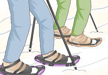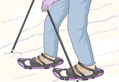 Use poles to help yourself along (optional). One or two poles can be used to help you maintain your balance and provide additional power, along with an upper body workout. They are especially helpful if you go snowshoeing in deep snow, but some snowshoers who stick to prepared trails don't bother using them. It does not matter whether you use ski poles or snowshoe poles, as long as they are a comfortable length for you to use.