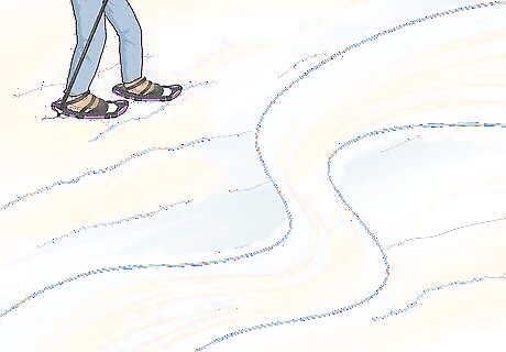 Dig the side of your snowshoe into slopes while walking along them. When traversing a slope at the same elevation, rather than traveling up or down, hit the side of the snowshoe into the slope for more support with each step. Lean in the uphill direction to keep yourself balanced. Poles may make traversing much easier.