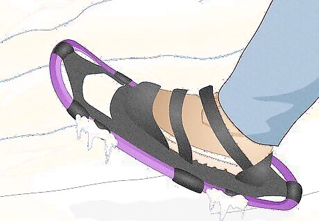 Kick into the snow with your toes if you're going uphill. This will dig your snowshoe into it, giving you more leverage to climb. If your kicking creates a deep hole rather than a firm step, find a different way up the slope. Many snowshoes have a "heel lift" which can be flipped up between your boot heel and the snowshoe. This provides a more stable support for your legs during steep ascents.