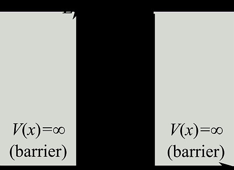 A={\sqrt {{\frac {2}{L}}}} Arrive at the wavefunction. This is the description of a particle inside a box, surrounded by infinite potential energy walls. While