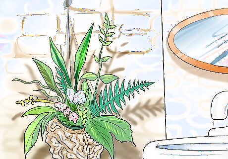 Add a vase of fresh flowers. Most bathrooms are finished in neutral tones, which can look a little drab even with accessories. A spray of daylilies or orchids will help brighten up the room and inject a splash of eye-catching color. For washrooms with more open layouts, you can create an air of lushness using larger plants like ferns. You can opt for fake flowers or greenery if desired. For example, place a fake succulent on the countertop or a jar of fake pussy willows on the edge of the tub. Position flowers and other plants in an out of the way section of the room so touring visitors don’t feel swamped when they walk in.