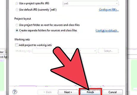 Enter a project name. You will see a window titled "Create a Java Project." The buttons "Next" and "Finish" at the bottom of the window will be greyed out until a project name is entered in the first field. To proceed, give your project a name and enter it into this field. For this tutorial, we will use the name "Project1." Enter the name and then click "Finish." Your new project will appear on the left-hand side of the screen under "Package Explorer" among existing projects. Projects are listed in alphabetical order.
