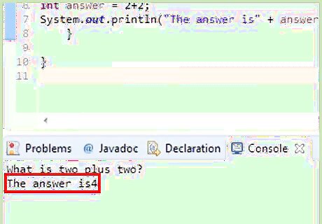 Verify that the output is what you expected. When your program runs, the output, should there be any, will be displayed on console at the bottom of the screen. In this tutorial, our Java program added two integers together. As two plus two equals four, the program is running as intended.