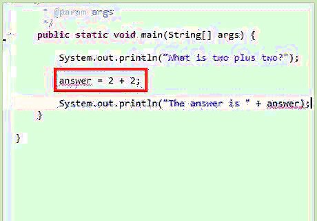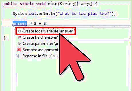 Watch out for errors in your code. Any errors will be underlined in red, and an icon with an "X" will show up on the left. Fix your errors. By mousing over an error icon, you can see a suggestion box that lists the ways you can fix the error. In this tutorial, we will double-click "Create local variable answer" so that the variable is declared first before it is used.
