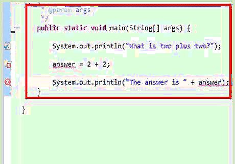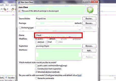 Start a new Java class. Before you begin writing code, you will need to create a new Java class. A class is a blueprint for an object. It defines the data stored in the object as well as its actions. Create a class by clicking the "New Java Class" icon, which looks like a green circle with the letter "C" in the center of it.