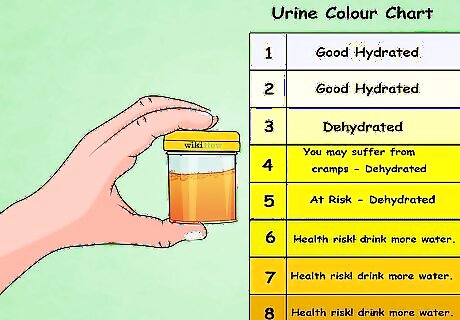 Know your water needs. Due to differences in climates and individuals, it's difficult to predict your exact needs. As a starting estimate, expect to sweat out 500–700 mL (17–24 oz) every hour while walking at 35ºC (95ºF), or 700–900 mL per hour of walking at 40ºC (104ºF). Drink enough water to make up for this amount, and pay attention to your urine. If your urine is mostly clear, you are well hydrated. If it is dark or has a strong smell, you need more water. Aim for the lower range of this estimate if you are in the shade, and the higher range when walking in the sun. You will not need as much water while sitting. Most people underestimate the amount of water they need. Rely on solid measurements or urine color, not on how thirsty you feel.