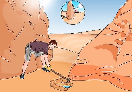 Dig in drainages. These are dry most of the year, but water may linger underground. The best option is a canyon with the mouth facing away from the sun (north in the Northern Hemisphere, or south in the Southern). Walk upstream and dig at the base of the wall, or anywhere that feels damp. In dry riverbeds, the force of the water may have eroded the outside bend of a river during a tight turn. The last flow of water may get trapped in an eroded depression here, so this is a good place to dig.