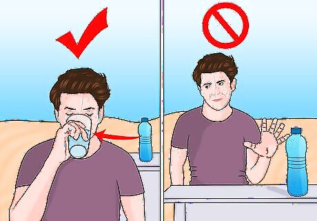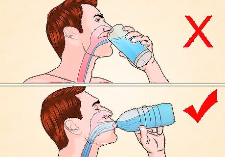Drink in swallows, not sips. Sipping water may prevent the water from reaching your vital organs. Drink at least a few swallows at a time to ensure effective hydration. Drinking too much water on an empty stomach can lead to vomiting. If you think this may happen, start with a swallow or two. Wait a few minutes for your stomach to settle, then drink some more.