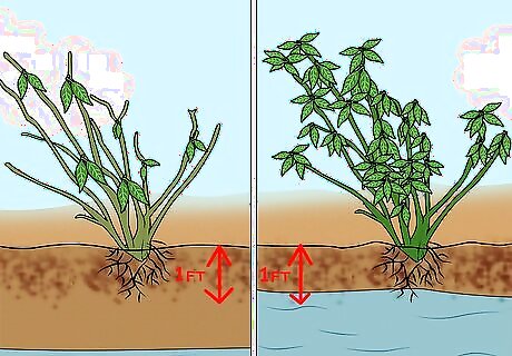 Dig near vegetation. In general, the greener the plant, and the wider its leaves, the more it needs a permanent water source. Digging near a promising tree or dense vegetation can sometimes lead to water. When digging, choose a low spot where water would naturally drain. Dig about 30 cm (1 ft) deep. If you notice damp soil, make the hole wider and wait a few hours for water to seep in.