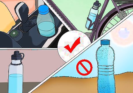 Bring along plenty of water. Bring more water than you need, in several containers. Store the excess back in your vehicle or shelter. If possible, store it somewhere away from direct sunlight, which can make water unpleasantly hot, and eventually wear down plastic containers.