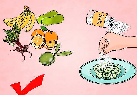 Include salt in your diet. You will also lose sodium and potassium as you sweat, which can decrease water retention and eventually cause serious health problems. Snack occasionally on food that contains salt, as well as potassium-rich foods such as bananas, dried apricots, or nuts. If your sweat does not taste salty, or does not sting when it falls into your eye, you need more salt. Salt only helps water retention if you are hydrated enough to take advantage of this effect. If you are dehydrated, large amounts of salt can make the problem worse.
