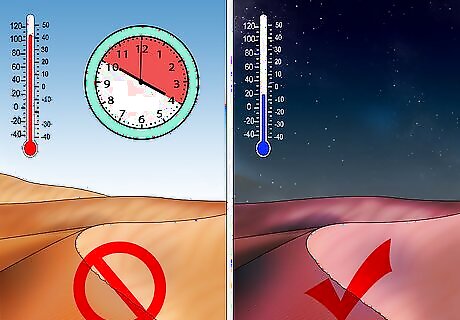 Seek shade in the hottest part of the day. In most deserts, especially in summer, conditions are brutally hot from about 10 am to 4 pm. One of the most effective ways to conserve water is to stay in shade during this time, away from wind. Do not exert yourself during this time. In an emergency situation, walk during the night instead of the day.