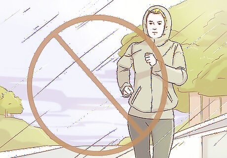 Don’t run in the rain. Running in the rain increases the likelihood of trips or slips. Rain also makes it more difficult for drivers to see you, and therefore increases the odds of being struck by a vehicle. Therefore, it’s best to avoid running in the rain. Even if you’re wearing reflective clothing in the rain, drivers might mistake your reflective clothing as a refraction from lights in raindrops. If you’re on a run and it starts raining, head home immediately. For similar reasons, avoid running in snow and fog.