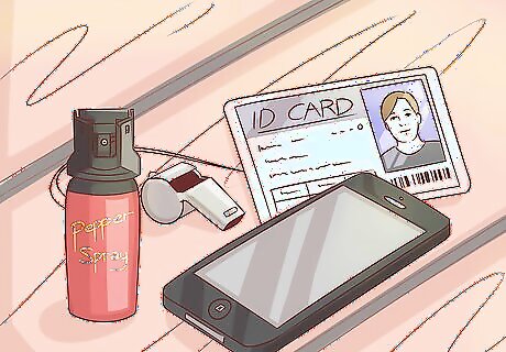 Pack the essentials. It’s a good idea to wear a fanny pack and put your phone inside just in case your route takes you away from people who can help you. You should also pack a whistle to attract attention if someone is attacking you. Bring pepper spray, too. Use your pepper spray if anyone tries to intercept or abduct you. Finally, carry an identification card with your name, phone number, and blood type. That way, if you’re injured and/or unconscious emergency personnel can provide appropriate medical care. Many people put the card with their essential information on it inside the sole of their running shoe.