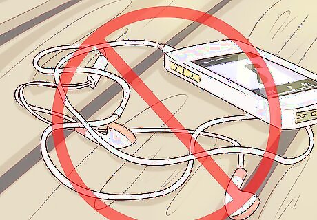 Don’t listen to music while running. Using headphones or earbuds is okay if you’re running in the gym or at home on a treadmill. But if you’re running outside, you should not wear earbuds in order to hear what’s going on around you. If a car honks at you, for instance, you should be able to hear it. Instead of listening to your portable music device, listen to your environment. You might hear interesting animals or snatches of conversation at opportune moments. Staying alert to your surroundings will both enrich your running experience and keep you safe. If you must listen to a portable music device, put only one earbud in.