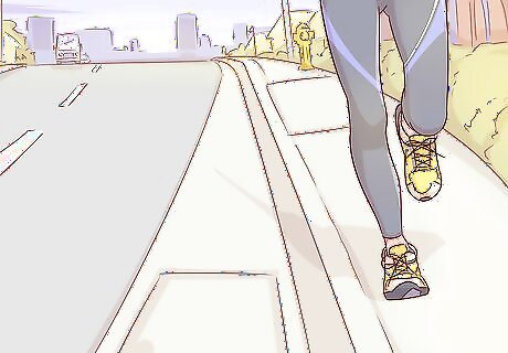 Stay on the sidewalk. The sidewalk is there for a reason. If you run in the road, you will be closer to passing vehicles, making it more likely that you will be injured in an auto accident. Sidewalks are set away from the road and therefore the safest place for runners. In some cases, you might have no choice but to run in the road – for instance, if the sidewalk ends or is under construction. In these cases, run against traffic as far as possible towards the curb or on the far edge of the shoulder. In other words, run in the traffic lane where you can see cars coming toward you and cars can see you coming toward them. That way, you’ll know how close a car is to the curb and be able to react appropriately.