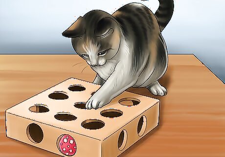 Give your cat a puzzle feeder. Another way you can enrich your cat’s environment and provide stimulation is with a puzzle feeder. A puzzle feeder is a toy that you place food inside of. The cat is rewarded with a treat when it solves the puzzle. This can distract your cat from playing in the toilet or turning on faucets.