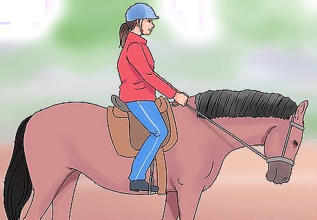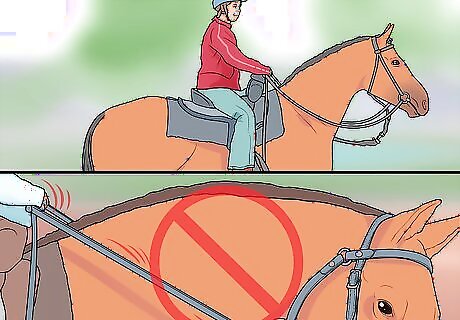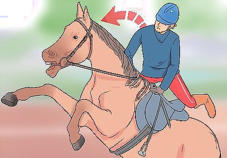Stay calm and avoid pulling back on the reins. While yanking on the reins is an understandable response to being on a rearing horse, this will actually only exacerbate the situation and may even cause the horse to fall backwards. Instead, relax and avoid doing anything that may add to the horse's stress. Don't lean your body back or to the sides, either; this may also cause you to fall off.