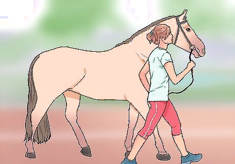 Try not to make any sudden or startling movements. As you move to stay at the horse's shoulder, keep your movements smooth and controlled. Making any sudden, wild, or jerking movements will only startle the horse and frighten it further. Don't make any sudden movements to try to calm the horse or hold it still.