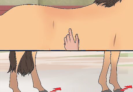 Push on the horse's side with your fingertips to move its rear legs. Since rearing involves the horse lifting its front feet into the air, a good way to prevent this in the moment is to get the horse to move its back legs while keeping its front legs on the ground. Gently push on 1 side of the horse with your fingertips until it moves, then ease up on the pressure. Continue doing this so that the horse moves its rear legs in a circular motion. Make sure that the horse's front feet remain in the same place the whole time you do this. Whenever you cease applying pressure with your fingertips, gently rub the area to “erase” the feeling of the pressure from it. Your horse will appreciate this kind gesture.