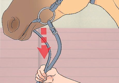 Tip its head toward you to control its forward motion. Once all 4 of the horse's feet are on the ground, tip its nose down and toward you to keep its attention on you. Lowering your horse's head this way will not only help it to relax and keep it from rearing up again, but will also prevent it from moving forward before you want it to. Horses tend to lift their heads and tense their neck muscles when they're anxious, so lowering your horse's head will thus cause it to loosen its neck muscles and relax. Don't try pulling your horse's head down as a means of physically preventing it from rearing. If the horse decides to put its full force into the rear, it will almost certainly overpower you.