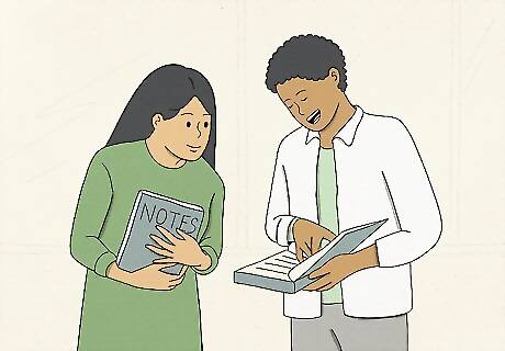 Work with others. Arrange study dates at a library with your friends to compare notes or explain things the other one might not understand. Working with other people can help you cover gaps in your own knowledge and also help you remember more information, since you may have to explain things to them or have conversations about the topic. It's also a great way to stay motivated. If you ask for help from others, don't joke around. Concentrate on what you are doing.