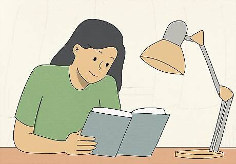 Turn on the light! Studying in a dark room is not recommended. Add lamps at night, or in the daytime, open the window coverings (open the window a little, too). People tend to study and focus better in a brighter, oxygenated room with little noise.